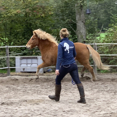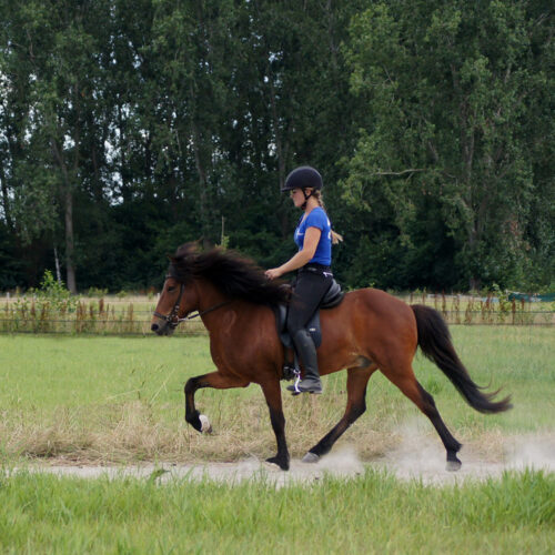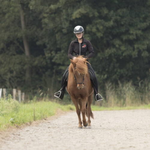 Het intölten is een belangrijk onderdeel voor de IJslanders. Belangrijk is dat ze leren tölten op een manier waarbij ze hun lijf goed blijven gebruiken. Niet iedere IJslander tölt makkelijk. Het verschilt per paard op welk moment in de training het goed is om de tölt te starten. Als je paard hier staat om ingetölt te worden krijg je zelf een aantal lessen (inclusief bij de training) om te zorgen dat je thuis goed samen verder kan werken. Ook in het intöltproces is aandacht voor de juiste fysieke basis, zodat daar op een verantwoorde manier op verder gebouwd kan worden. Tölt je paard wel, maar zijn de gangen niet goed gescheiden of is hij erg lateraal/diagonaal? Dan kun je natuurlijk ook hier terecht en gaan we samen zorgen dat de puntjes op de ‘i’ worden gezet.